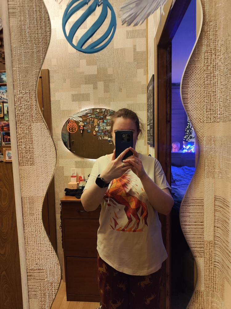 Женская новогодняя пижама с Лошадью — символом 2026 года сочетает уют, стиль и праздничное настроение. Модель выполнена из мягкого трикотажа 100% хлопок плотностью 160 г/м², который дышит, приятно ощущается на коже и не вызывает раздражений, поэтому подходит для ежедневного отдыха и сна. Верх комплекта — свободная однотонная футболка с ярким принтом Лошади. Современная графика подчёркивает новогоднюю тематику, а спущенный рукав и круглая горловина с аккуратной окантовкой делают посадку комфортной и расслабленной. Футболка не стесняет движений и легко садится по фигуре благодаря свободному силуэту. Штаны выполнены из трикотажа с набивным рисунком лошадей, который создаёт выразительный праздничный образ. Фасон — широкий, свободный, идеально подходящий для сна и домашних дел. В боковых швах находятся удобные карманы, добавляющие практичности. Особое внимание привлекает широкий простроченный пояс, мягко фиксирующий посадку и не вызывающий дискомфорта. Пижама прекрасно подходит для уютных семейных вечеров, подарков и новогодних фотосессий. Она является частью коллекции Family Look, что позволяет собрать гармоничный комплект для всей семьи в едином стиле. Мягкая, лёгкая и праздничная, эта пижама подарит комфорт и создаст настроение зимнего уюта.